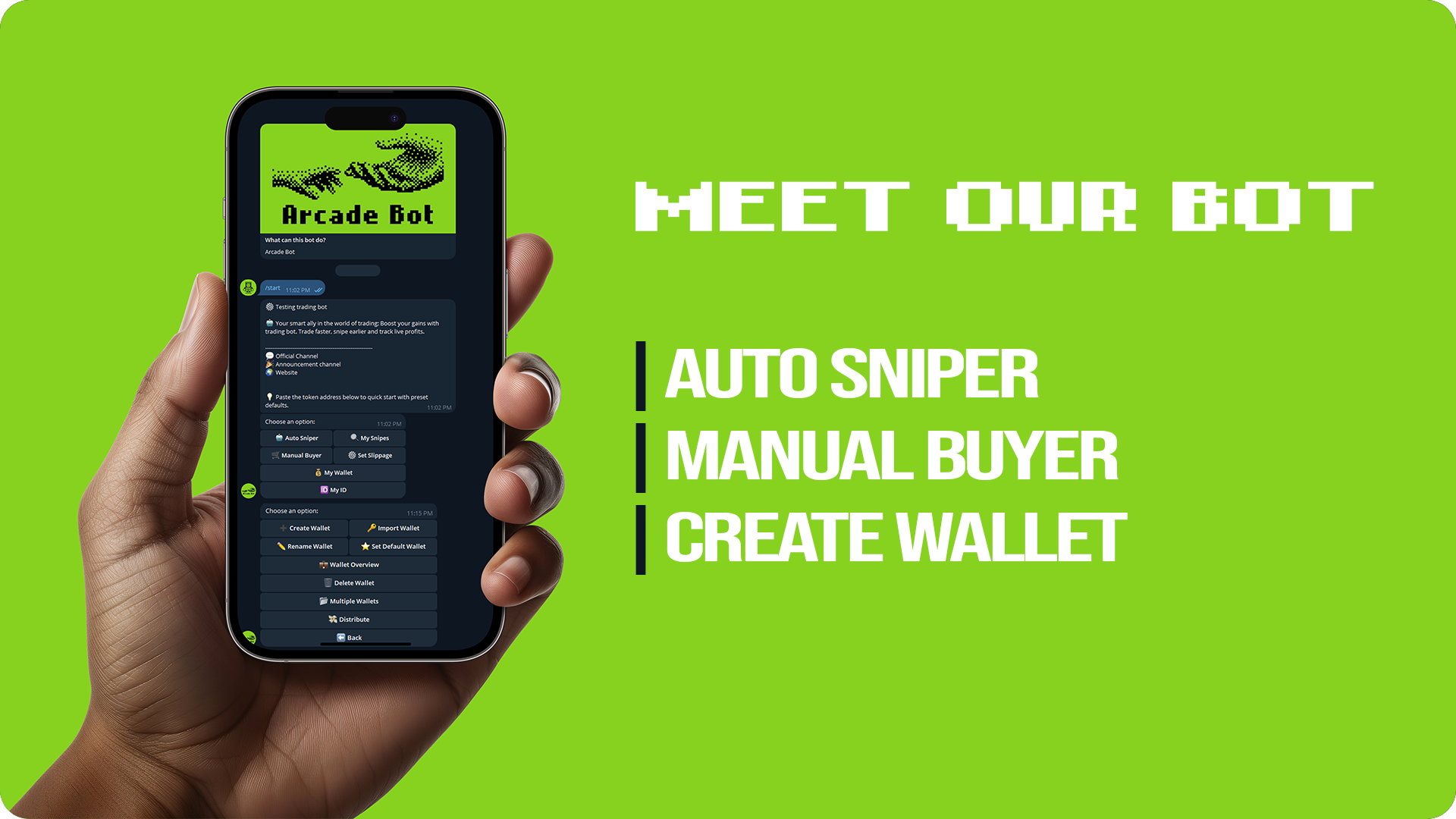 Arcade Bot empowers you with cutting-edge features like Auto Sniper for lightning-fast trades, Manual Buyer for precision control, and seamless wallet management. Whether you're tracking your snipes or distributing funds across multiple wallets, Arcade Bot ensures your trading experience is efficient and rewarding. Customize your strategy with adjustable slippage settings and enjoy the convenience of managing your assets with ease. Elevate your trading game with Arcade Bot—where innovation meets opportunity. Launch bot soon.